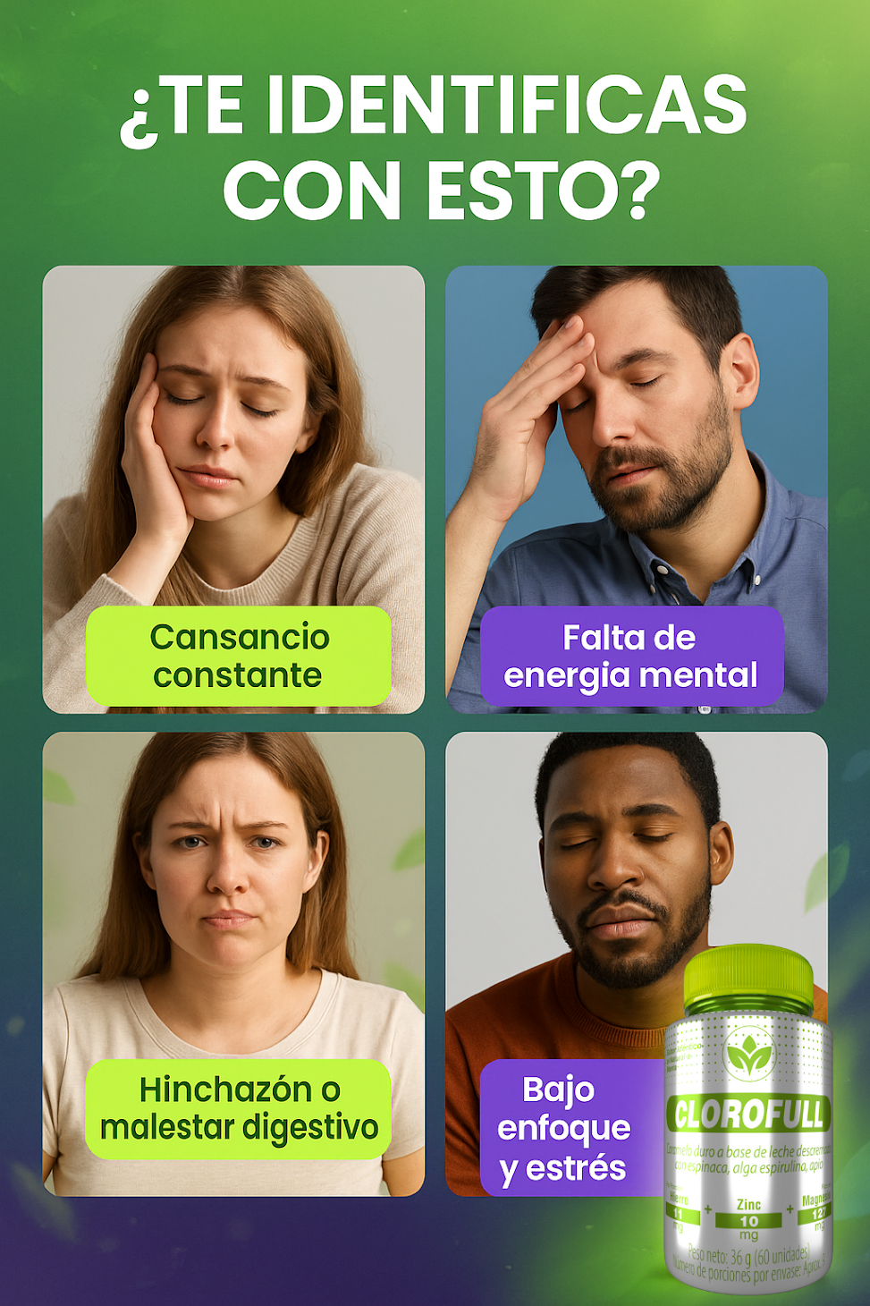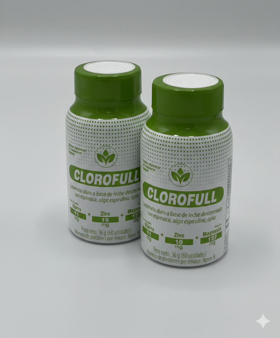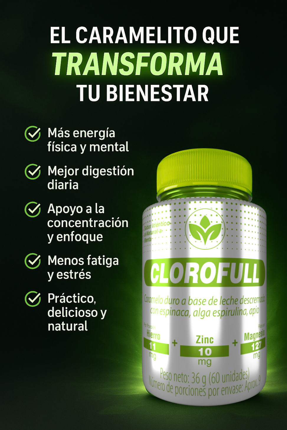 No normalices el cansancio constante, la falta de concentración o la hinchazón. Clorofull —pastillas con clorofila, hierro, magnesio y zinc— apoya la energía, el enfoque y el bienestar digestivo con consumo diario. Fácil de incorporar a tu rutina.