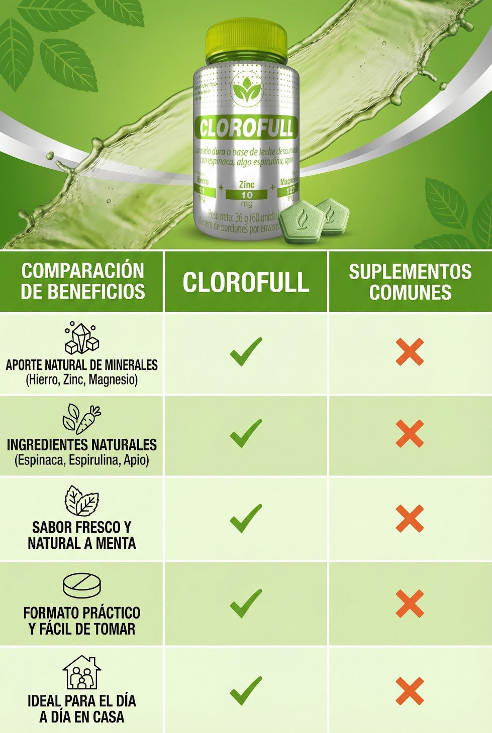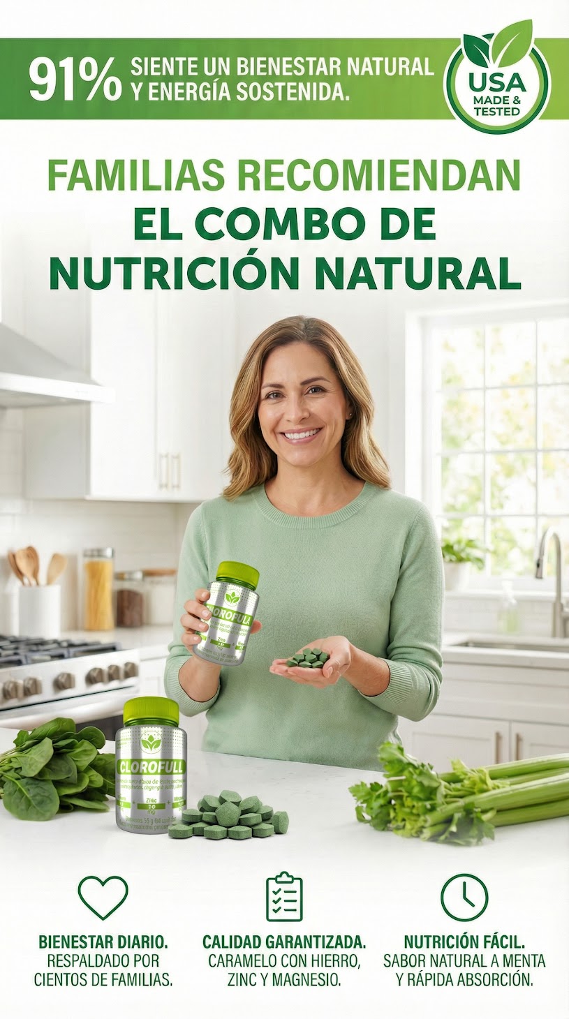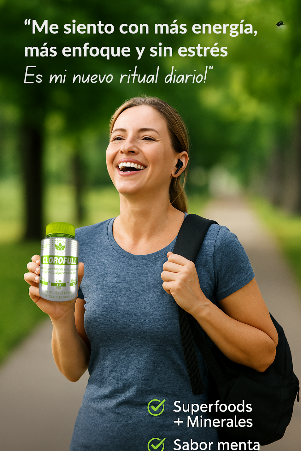 No normalices el cansancio constante, la falta de concentración o la hinchazón. Clorofull —pastillas con clorofila, hierro, magnesio y zinc— apoya la energía, el enfoque y el bienestar digestivo con consumo diario. Fácil de incorporar a tu rutina.